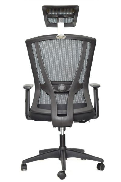 Espaldar alto, Marco perimetral en polipropileno, en malla poliester tensada y soporte lumbar tapizado, regulable en altura y profundidad.